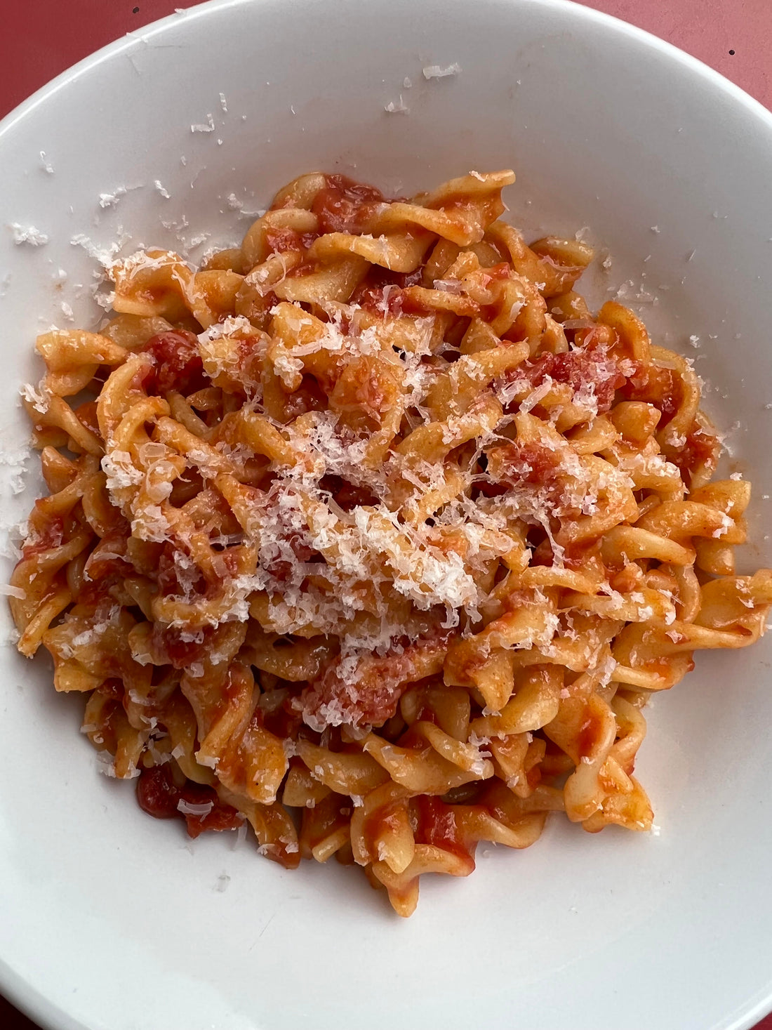 5. Once sauce is ready, remove basil, add cream, simmer for another 4-5 minutes and toss with your pasta of choice. Garnish with additional basil and/or parmesan and serve.