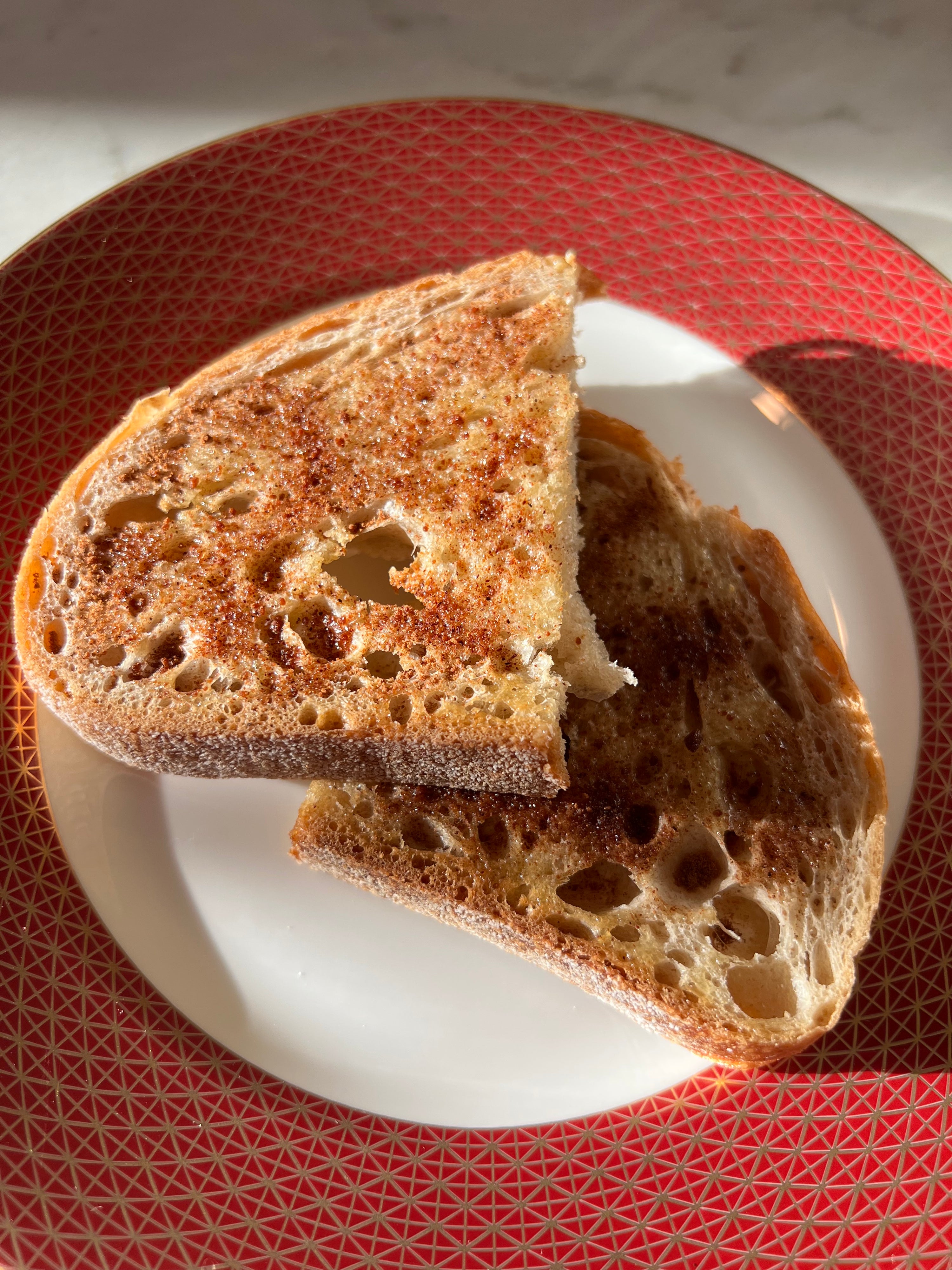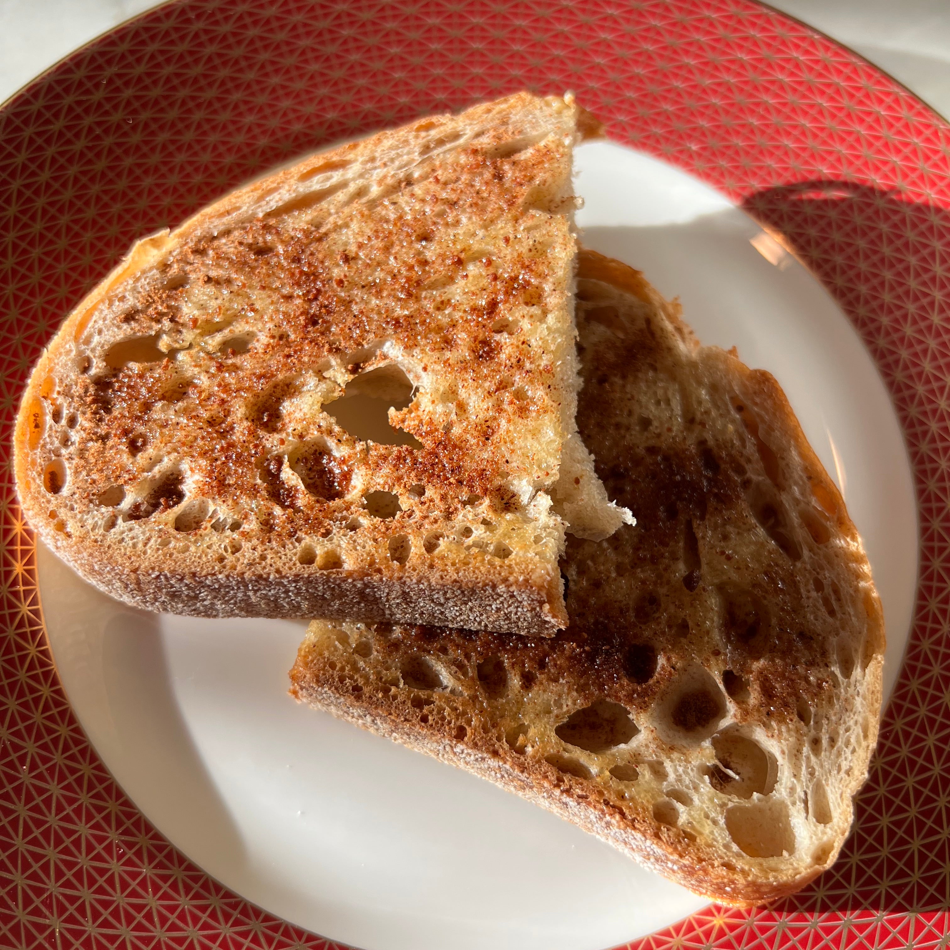 - Simply sprinkled on buttered toast (it tastes like a Cinnamon Crunch bagel!)